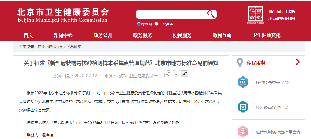 日前,据北京市市场监督管理局网站消息,北京市卫生健康委员会组织制定的《新型冠状病毒核酸检测样本采集点管理规范》,说明了新型冠状病毒核酸检测样本采集点的基本要求、采集点设置、设施设备及物品、人员要求、样本采集、样本保存及运输、医疗废弃物处理、环境消杀等多方面做出要求,指导北京的核酸采样管理。