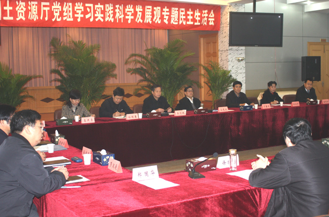 会议由省国土资源厅党组书记、厅长杜云生主持,国土资源厅全部党组成员参加了会议,包括副厅长熊政春、李成林、陈新武,纪检组长丁玉洋、总工程师徐振坤、执法监察总队长李维学、国土整治办主任郑国华,地质灾害办主任夏早发等,分别介绍了自己深入学习科学发展观的的认识和感受。